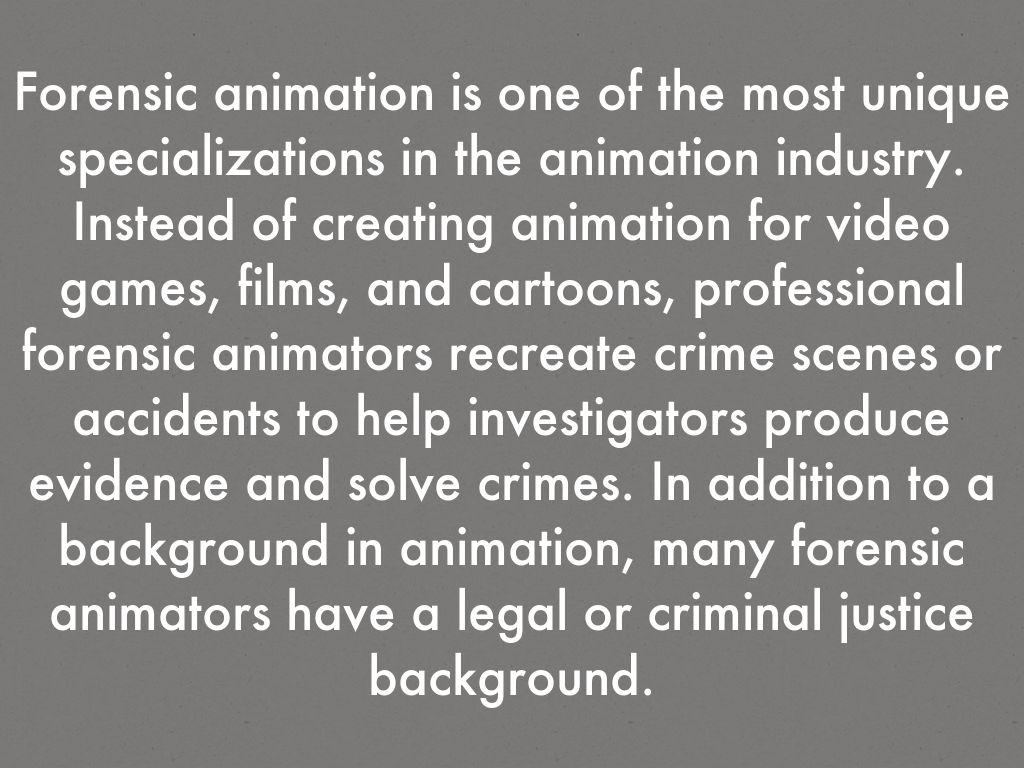 Forensic animation is one of the most unique specializations in the animation industry. Instead of creating animation for video games, films, and cartoons, professional forensic animators recreate crime scenes or accidents to help investigators produce evidence and solve crimes. In addition to a background in animation, many forensic animators have a legal or criminal justice background.