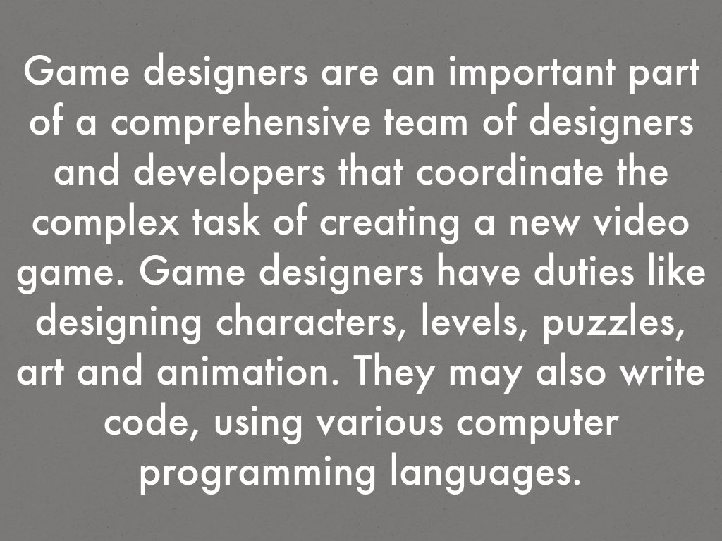 Game designers are an important part of a comprehensive team of designers and developers that coordinate the complex task of creating a new video game. Game designers have duties like designing characters, levels, puzzles, art and animation. They may also write code, using various computer programming languages.