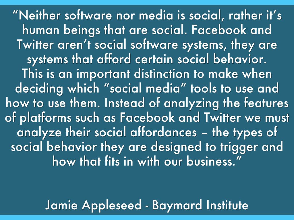 “Neither software nor media is social, rather it’s human beings that are social. Facebook and Twitter aren’t social software systems, they are systems that afford certain social behavior. This is an important distinction to make when deciding which “social media” tools to use and how to use them. Instead of analyzing the features of platforms such as Facebook and Twitter we must analyze their social affordances – the types of social behavior they are designed to trigger and how that fits in with our business.”