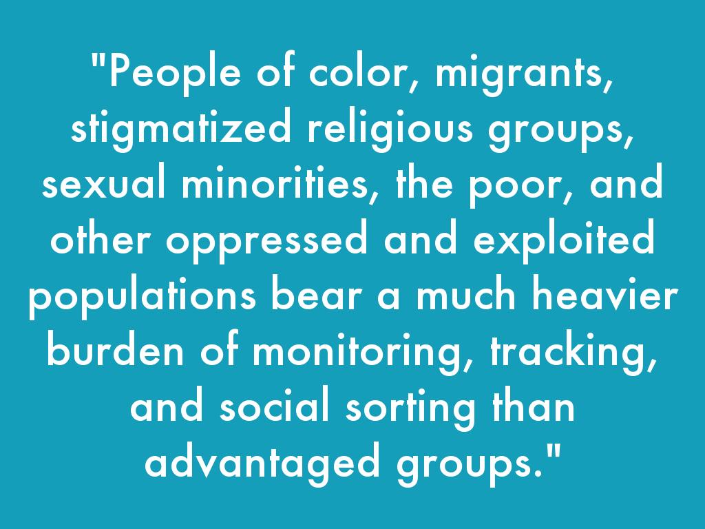 "People of color, migrants, stigmatized religious groups, sexual minorities, the poor, and other oppressed and exploited populations bear a much heavier burden of monitoring, tracking, and social sorting than advantaged groups."