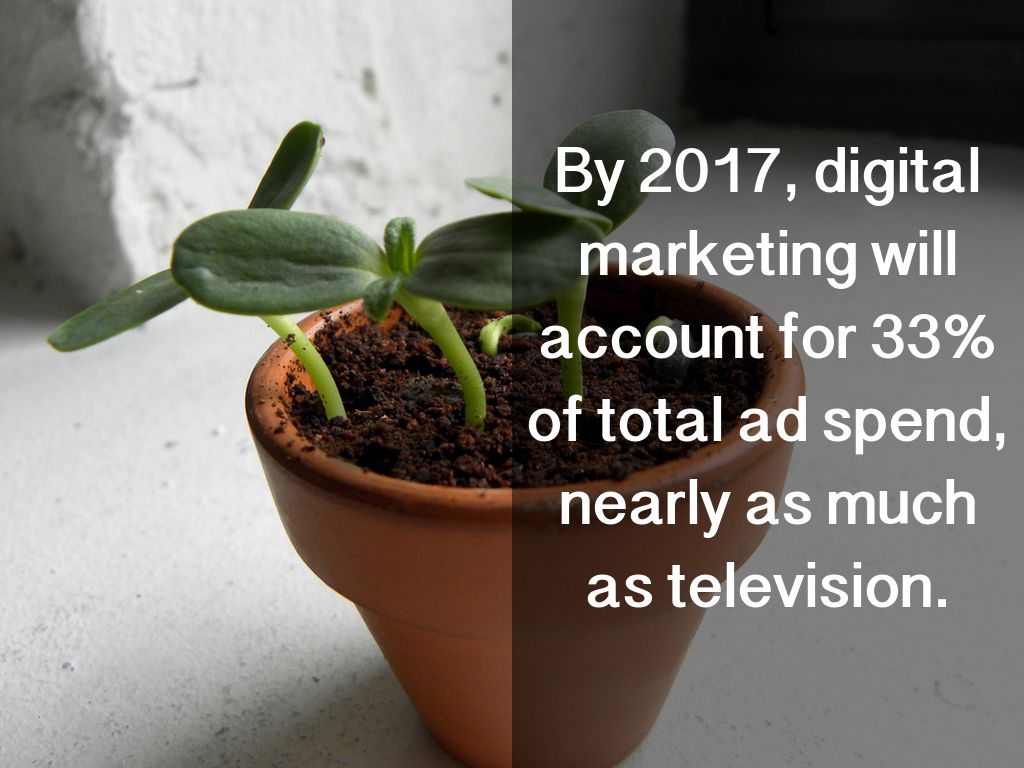 By 2017, digital marketing will account for 33% of total ad spend, nearly as much as television.