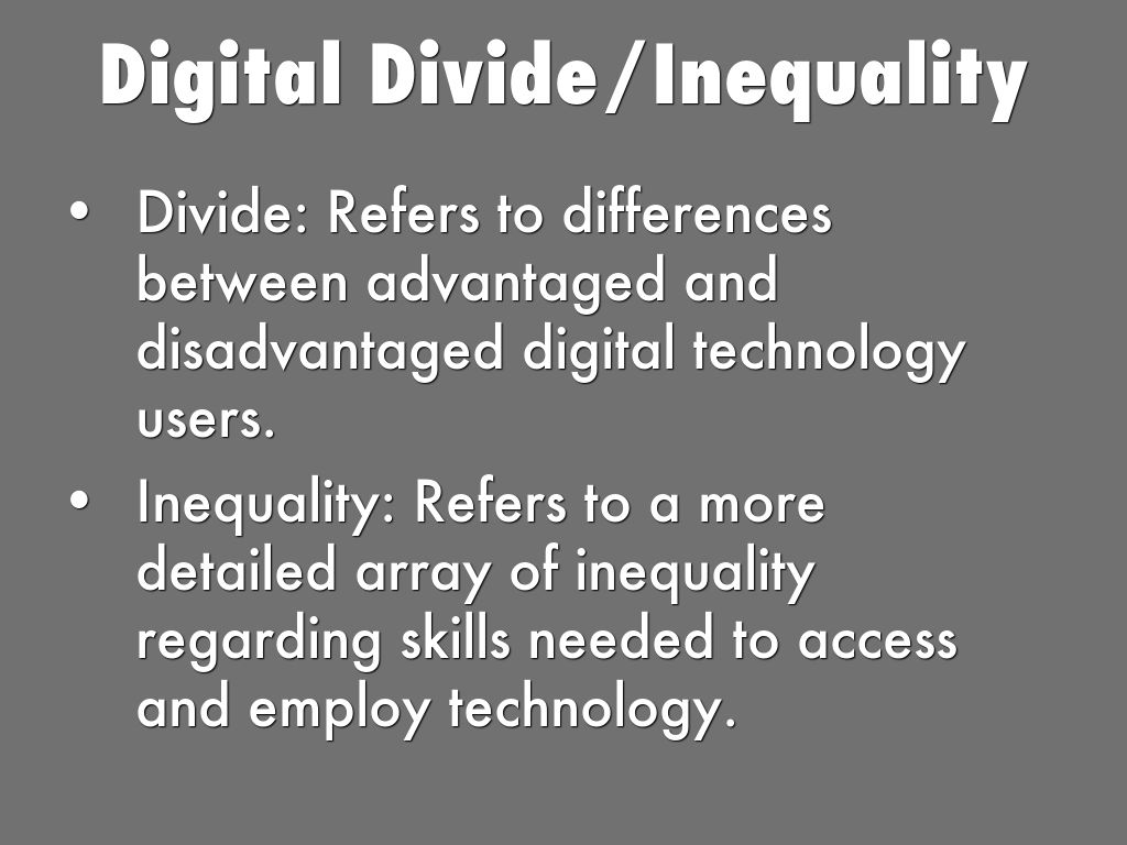 - Inequality: Refers to a more detailed array of inequality regarding skills needed to access and employ technology.