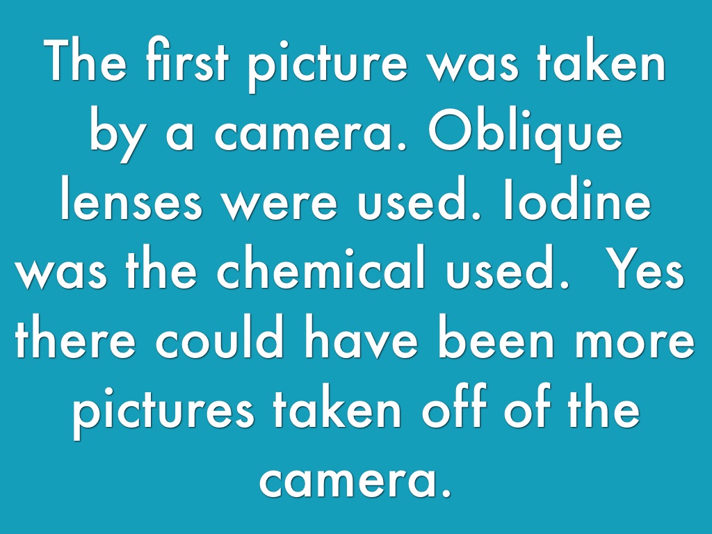 The first picture was taken by a camera. Oblique lenses were used. Iodine was the chemical used. Yes there could have been more pictures taken off of the camera.