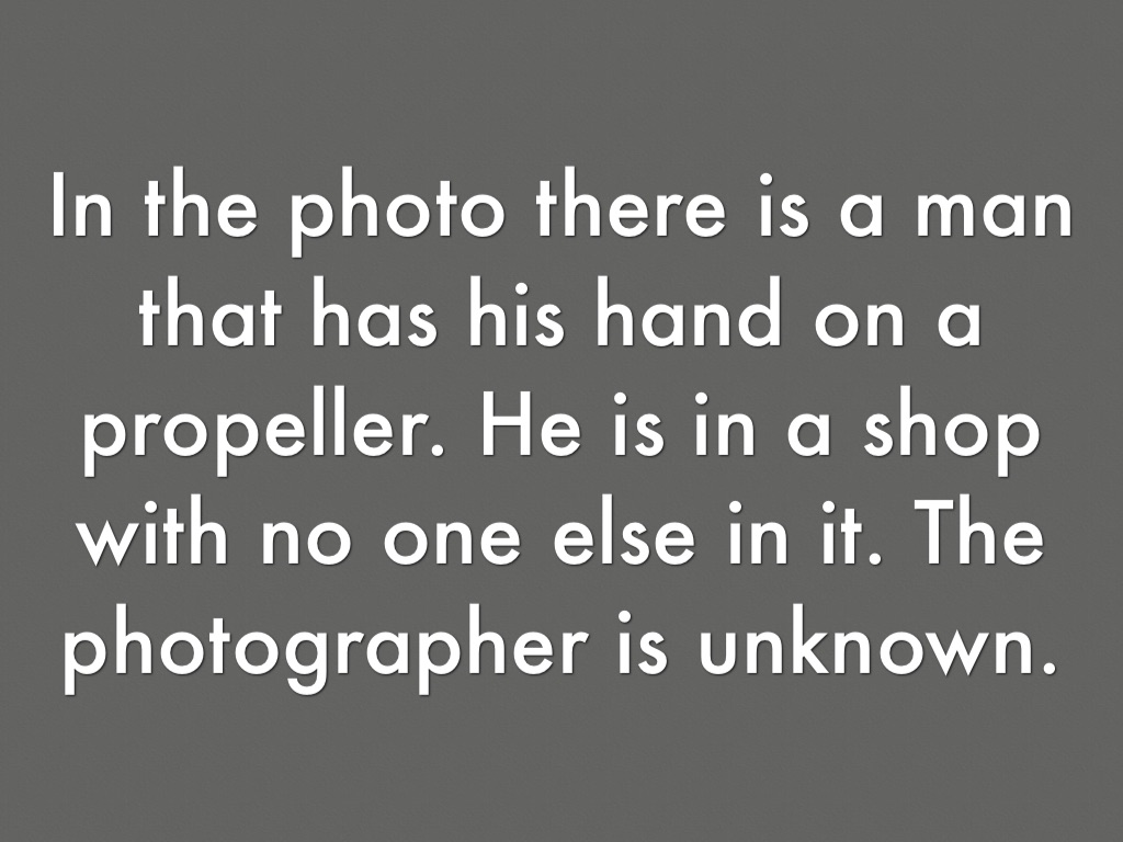 In the photo there is a man that has his hand on a propeller. He is in a shop with no one else in it. The photographer is unknown.