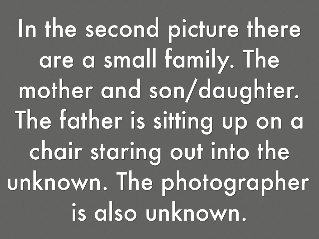 In the second picture there are a small family. The mother and son/daughter. The father is sitting up on a chair staring out into the unknown. The photographer is also unknown.