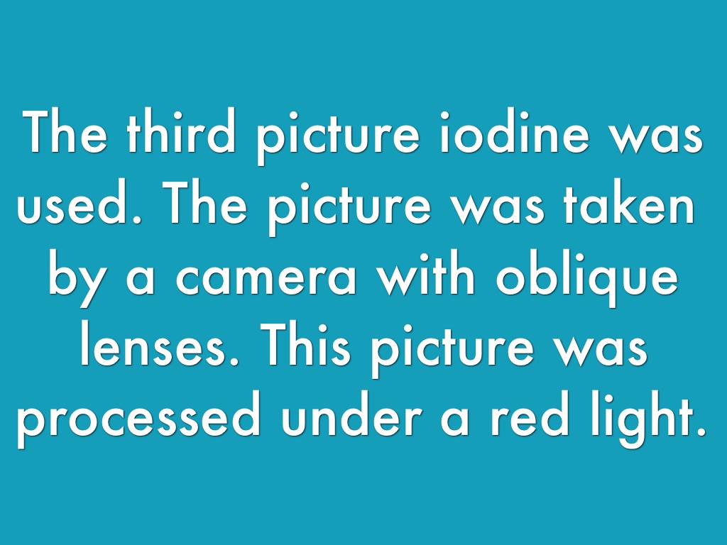 The third picture iodine was used. The picture was taken by a camera with oblique lenses. This picture was processed under a red light.