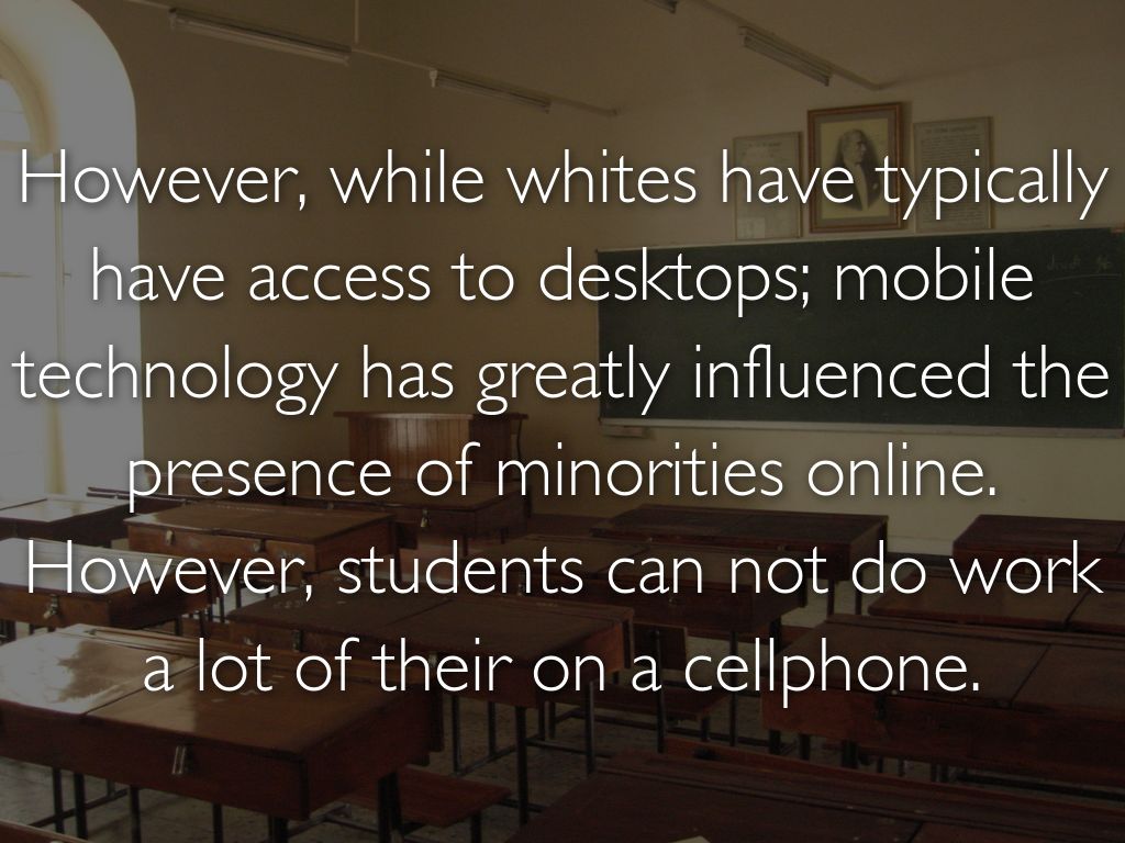 However, while whites have typically have access to desktops; mobile technology has greatly influenced the presence of minorities online. However, students can not do work a lot of their on a cellphone.