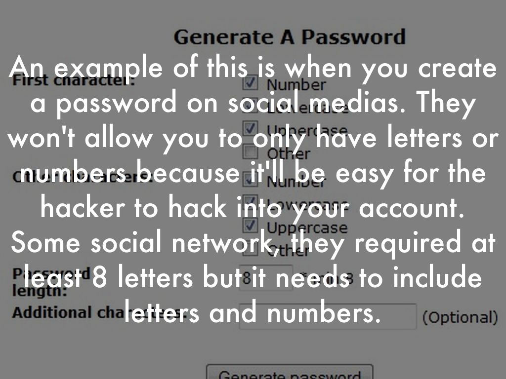 An example of this is when you create a password on social medias. They won't allow you to only have letters or numbers because it'll be easy for the hacker to hack into your account. Some social network, they required at least 8 letters but it needs to include letters and numbers.