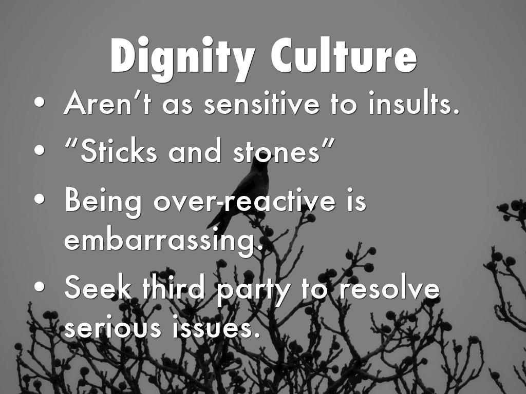 In a dignity culture, everyone has worth; and therefore, this worth can’t be taken away by a slight. Over-reaction is seen as a lack of confidence.
