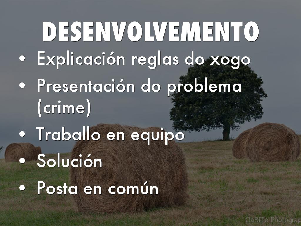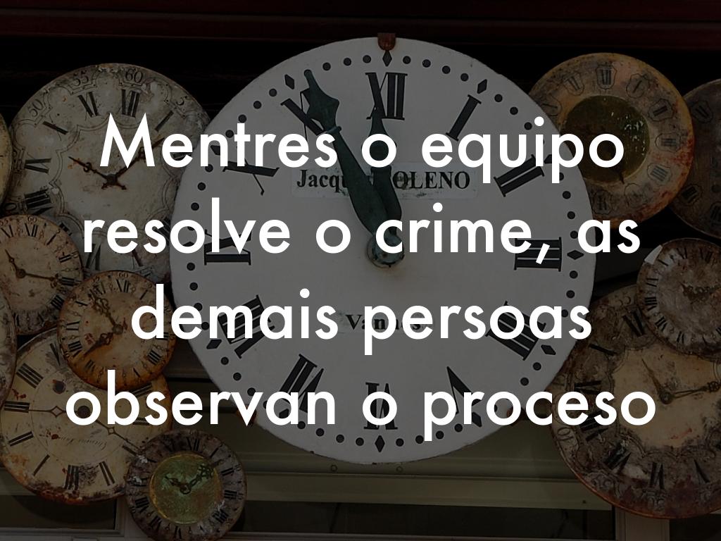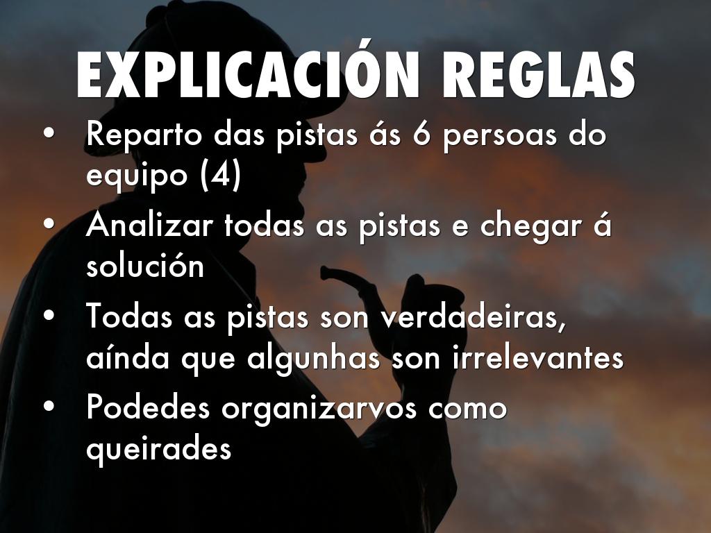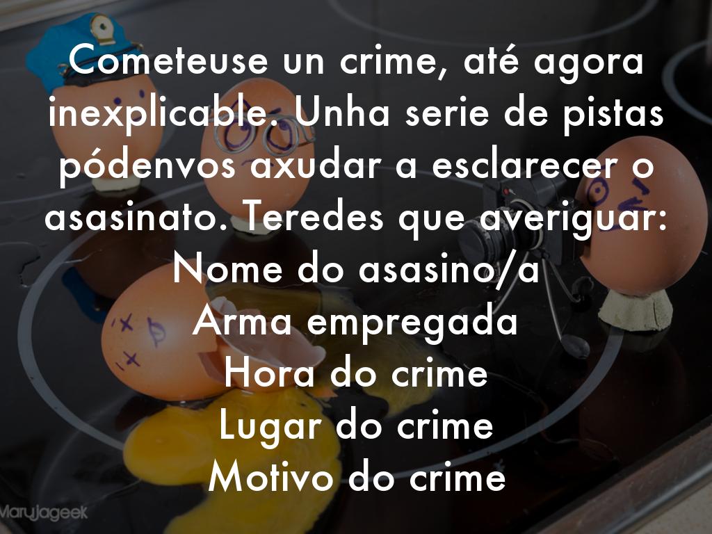 Cometeuse un crime, até agora inexplicable. Unha serie de pistas pódenvos axudar a esclarecer o asasinato. Teredes que averiguar: Nome do asasino/a Arma empregada Hora do crime Lugar do crime Motivo do crime