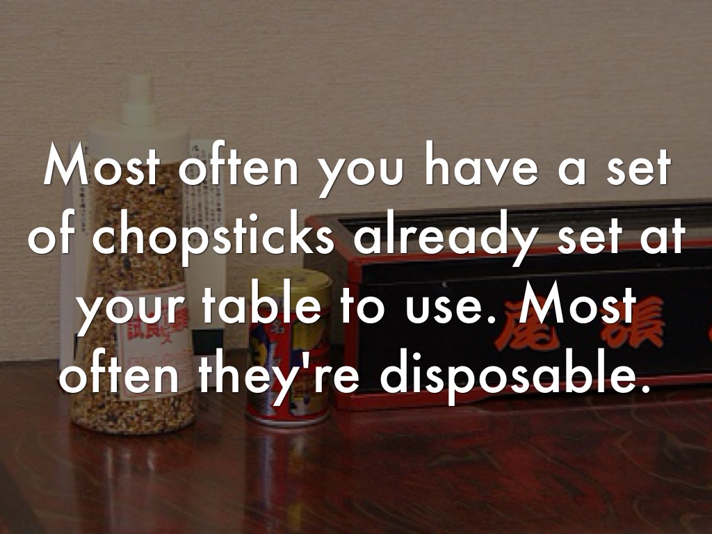Most often you have a set of chopsticks already set at your table to use. Most often they're disposable.