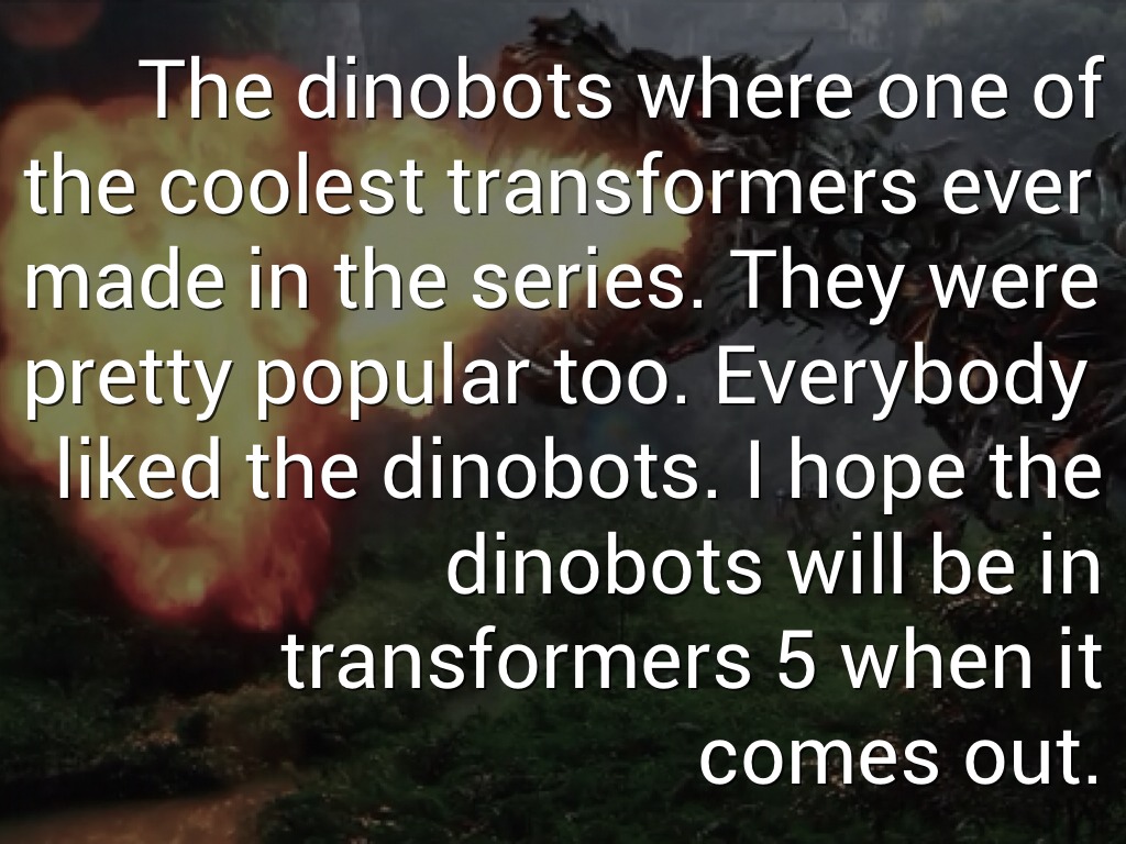 The dinobots where one of the coolest transformers ever made in the series. They were pretty popular too. Everybody liked the dinobots. I hope the dinobots will be in transformers 5 when it comes out.