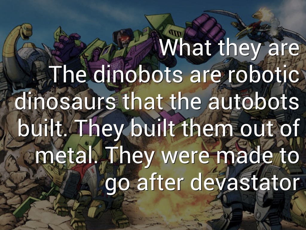 The dinobots are robotic dinosaurs that the autobots built. They built them out of metal. They were made to go after devastator