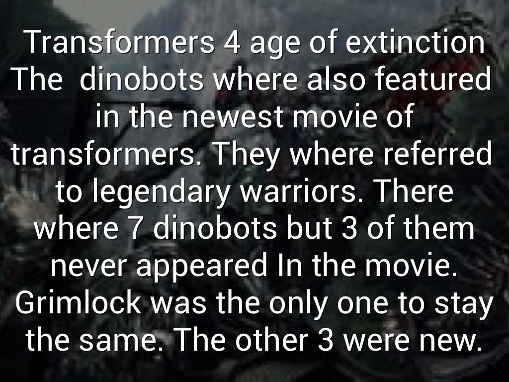 The dinobots where also featured in the newest movie of transformers. They where referred to legendary warriors. There where 7 dinobots but 3 of them never appeared In the movie. Grimlock was the only one to stay the same. The other 3 were new.