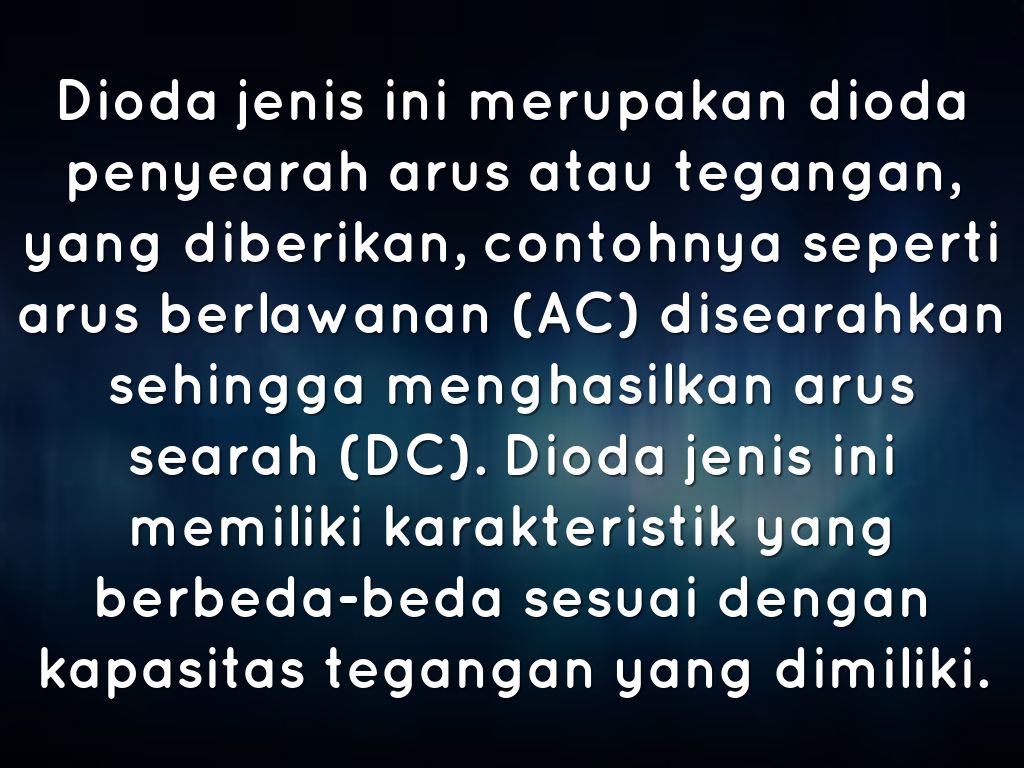 Dioda jenis ini merupakan dioda penyearah arus atau tegangan, yang diberikan, contohnya seperti arus berlawanan (AC) disearahkan sehingga menghasilkan arus searah (DC). Dioda jenis ini memiliki karakteristik yang berbeda-beda sesuai dengan kapasitas tegangan yang dimiliki.