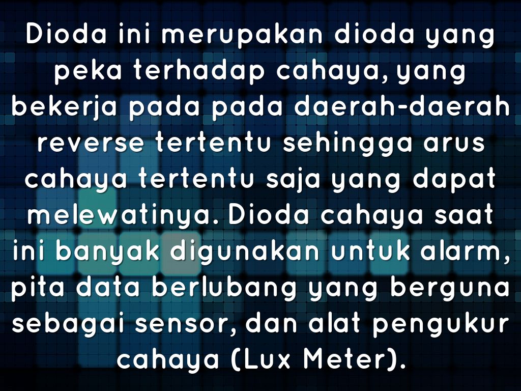 Dioda ini merupakan dioda yang peka terhadap cahaya, yang bekerja pada pada daerah-daerah reverse tertentu sehingga arus cahaya tertentu saja yang dapat melewatinya. Dioda cahaya saat ini banyak digunakan untuk alarm, pita data berlubang yang berguna sebagai sensor, dan alat pengukur cahaya (Lux Meter).