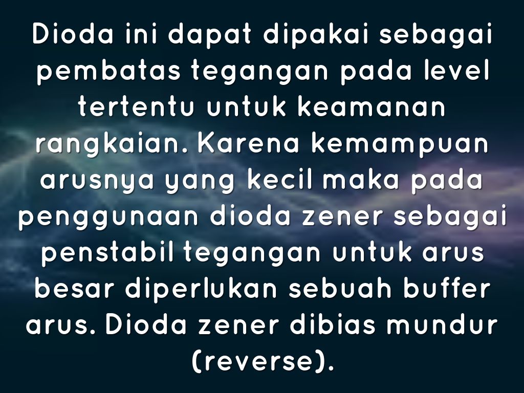 Dioda ini dapat dipakai sebagai pembatas tegangan pada level tertentu untuk keamanan rangkaian. Karena kemampuan arusnya yang kecil maka pada penggunaan dioda zener sebagai penstabil tegangan untuk arus besar diperlukan sebuah buffer arus. Dioda zener dibias mundur (reverse).