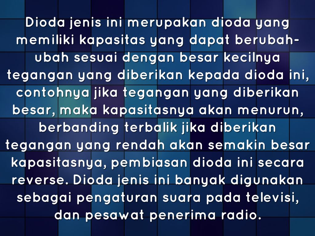 Dioda jenis ini merupakan dioda yang memiliki kapasitas yang dapat berubah-ubah sesuai dengan besar kecilnya tegangan yang diberikan kepada dioda ini, contohnya jika tegangan yang diberikan besar, maka kapasitasnya akan menurun, berbanding terbalik jika diberikan tegangan yang rendah akan semakin besar kapasitasnya, pembiasan dioda ini secara reverse. Dioda jenis ini banyak digunakan sebagai pengaturan suara pada televisi, dan pesawat penerima radio.