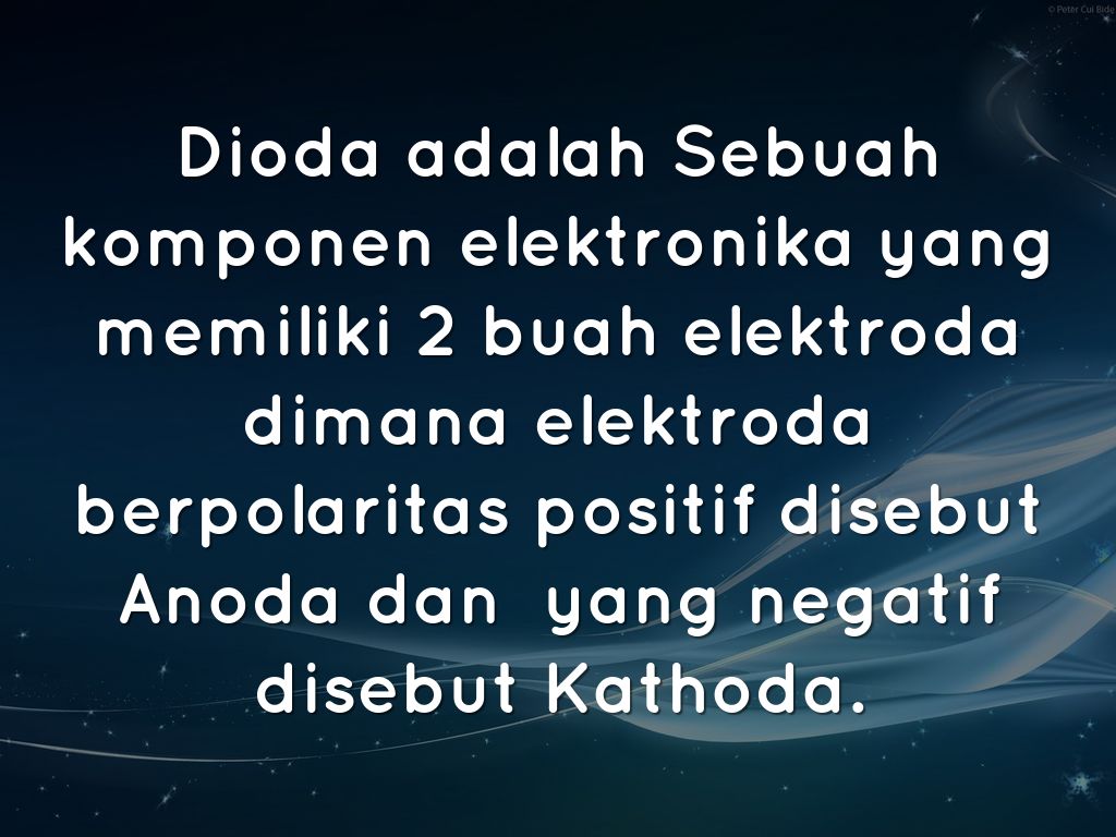 Dioda adalah Sebuah komponen elektronika yang memiliki 2 buah elektroda dimana elektroda berpolaritas positif disebut Anoda dan yang negatif disebut Kathoda.