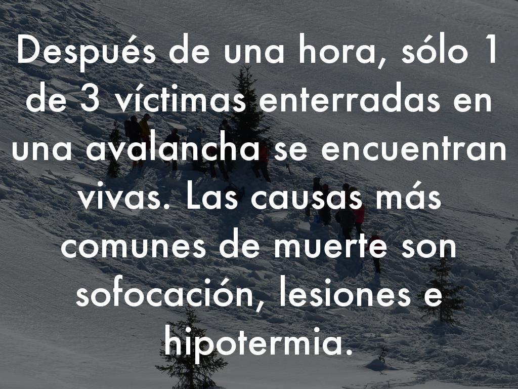 Después de una hora, sólo 1 de 3 víctimas enterradas en una avalancha se encuentran vivas. Las causas más comunes de muerte son sofocación, lesiones e hipotermia.