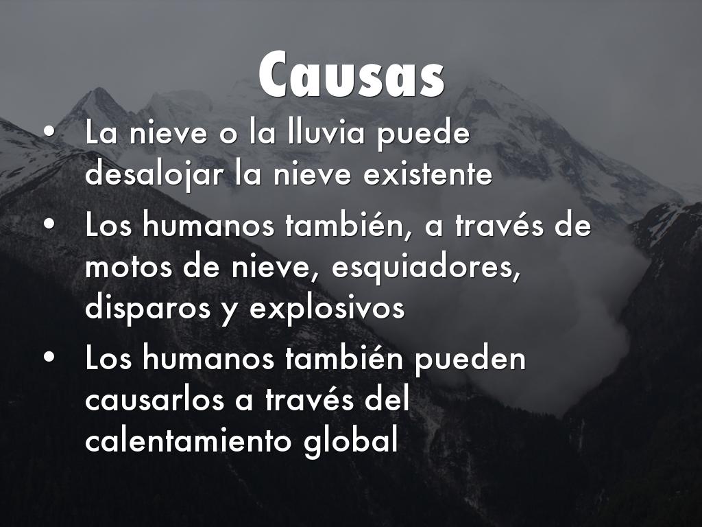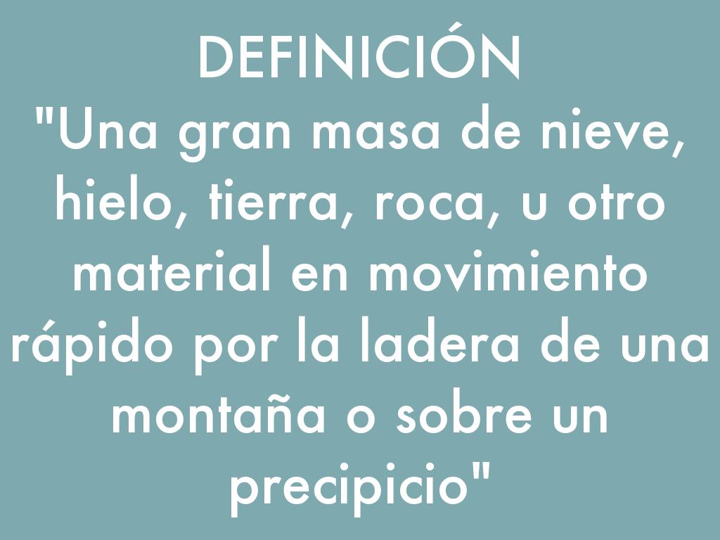 "Una gran masa de nieve, hielo, tierra, roca, u otro material en movimiento rápido por la ladera de una montaña o sobre un precipicio"