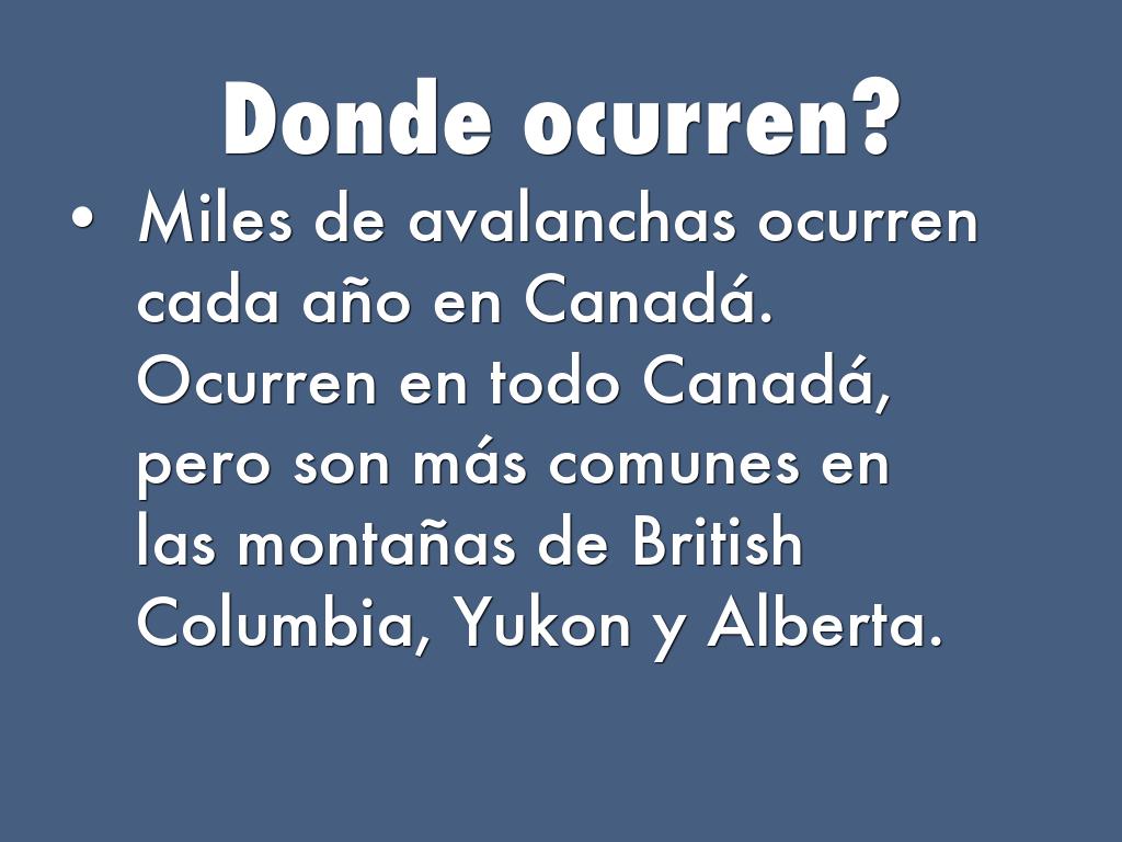 Miles de avalanchas ocurren cada año en Canadá. Ocurren en todo Canadá, pero son más comunes en las montañas de British Columbia, Yukon y Alberta.