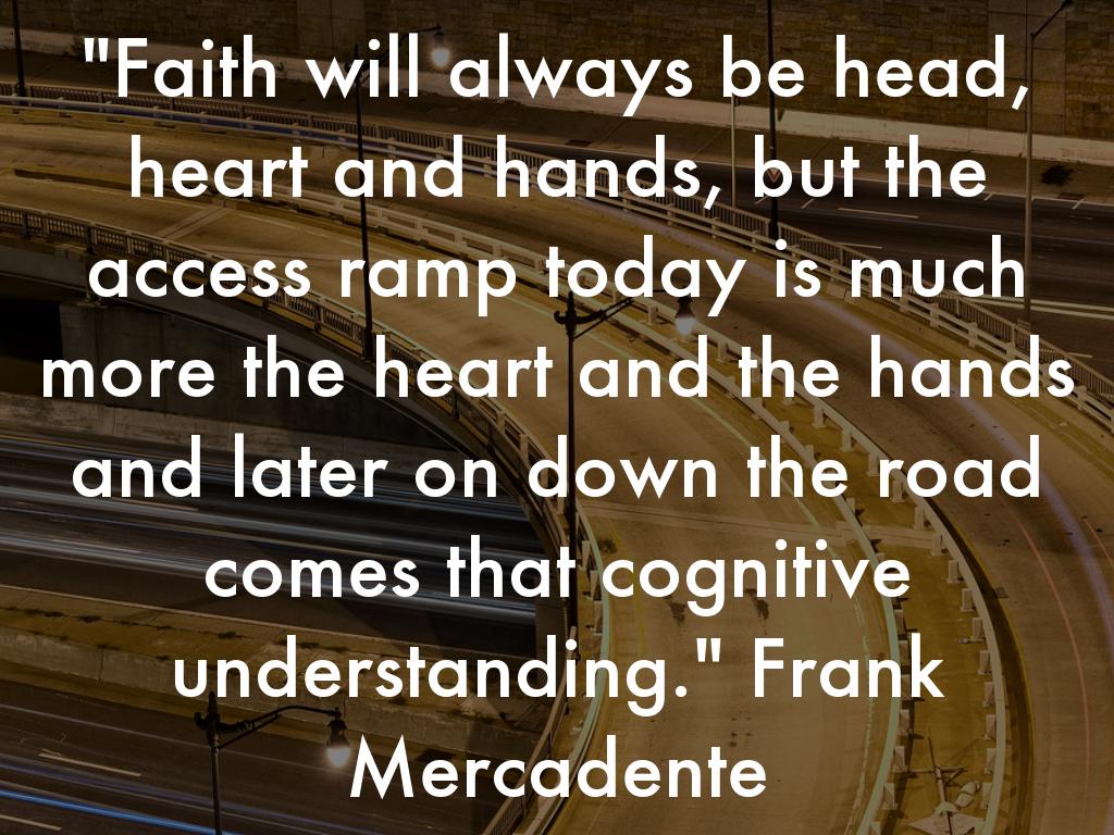 "Faith will always be head, heart and hands, but the access ramp today is much more the heart and the hands and later on down the road comes that cognitive understanding." Frank Mercadente