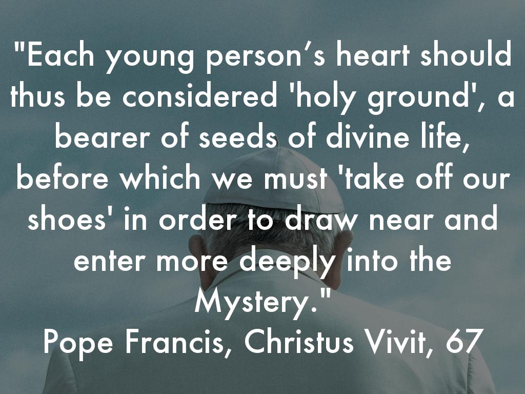 "Each young person’s heart should thus be considered 'holy ground', a bearer of seeds of divine life, before which we must 'take off our shoes' in order to draw near and enter more deeply into the Mystery."