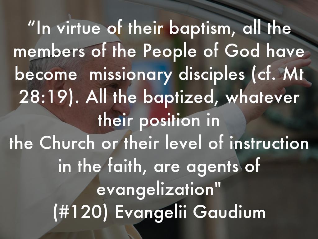 “In virtue of their baptism, all the members of the People of God have become missionary disciples (cf. Mt 28:19). All the baptized, whatever their position in