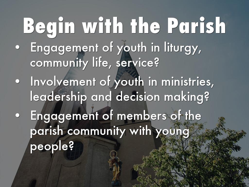 • "...community has an important role in the accompaniment of young people; it should feel collectively responsible for accepting, motivating, encouraging and challenging them." Pope Francis, Christus Vivit, 243.