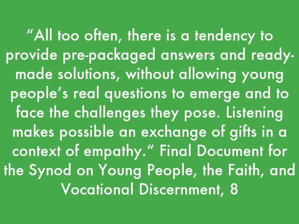 “All too often, there is a tendency to provide pre-packaged answers and ready- made solutions, without allowing young people’s real questions to emerge and to face the challenges they pose. Listening makes possible an exchange of gifts in a context of empathy.“ Final Document for the Synod on Young People, the Faith, and Vocational Discernment, 8