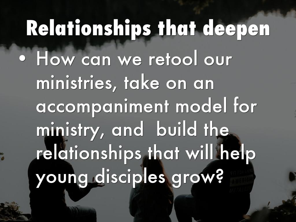 • How can we retool our ministries, take on an accompaniment model for ministry, and build the relationships that will help young disciples grow?