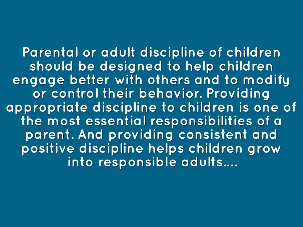 Parental or adult discipline of children should be designed to help children engage better with others and to modify or control their behavior. Providing appropriate discipline to children is one of the most essential responsibilities of a parent. And providing consistent and positive discipline helps children grow into responsible adults.