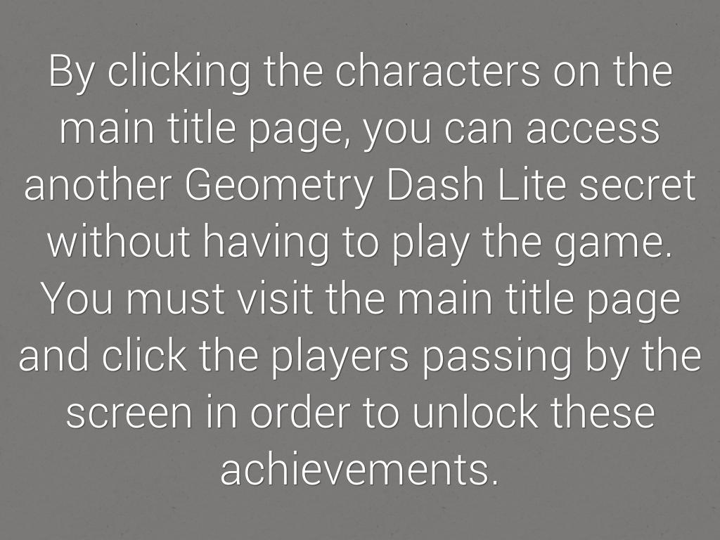 By clicking the characters on the main title page, you can access another Geometry Dash Lite secret without having to play the game. You must visit the main title page and click the players passing by the screen in order to unlock these achievements.
