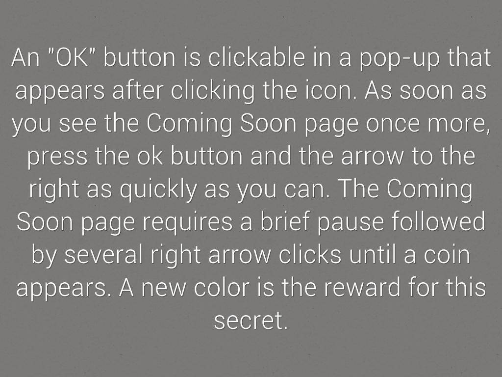 An "OK" button is clickable in a pop-up that appears after clicking the icon. As soon as you see the Coming Soon page once more, press the ok button and the arrow to the right as quickly as you can. The Coming Soon page requires a brief pause followed by several right arrow clicks until a coin appears. A new color is the reward for this secret.