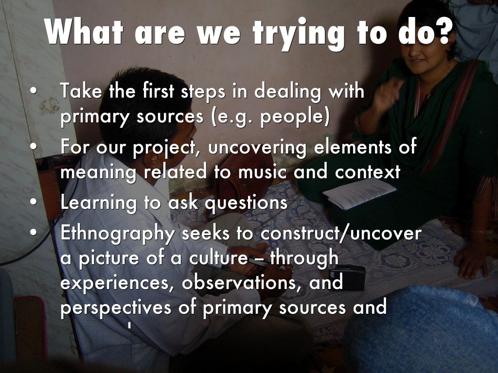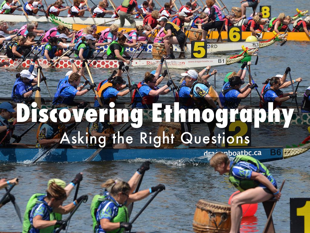 Ethnography seeks to construct/uncover a picture of a culture -- through experiences, observations, and perspectives of primary sources and researcher