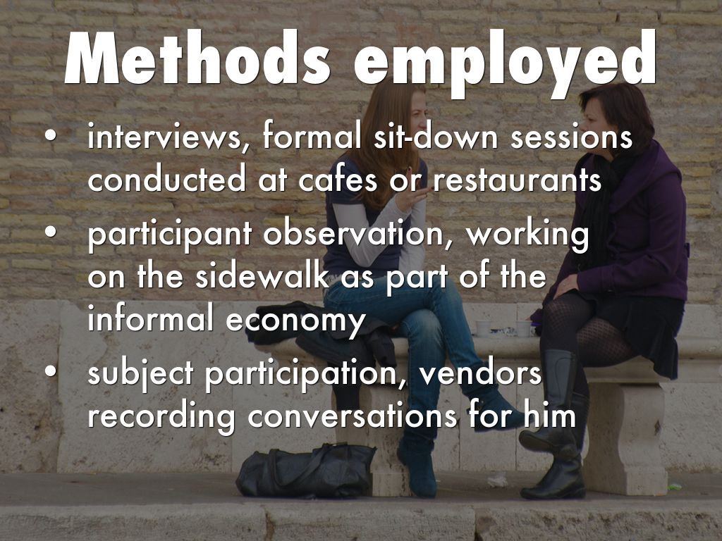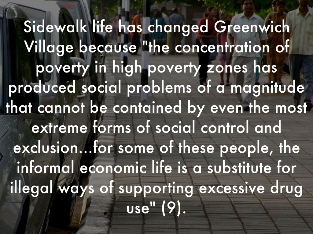 Sidewalk life has changed Greenwich Village because "the concentration of poverty in high poverty zones has produced social problems of a magnitude that cannot be contained by even the most extreme forms of social control and exclusion...for some of these people, the informal economic life is a substitute for illegal ways of supporting excessive drug use" (9).