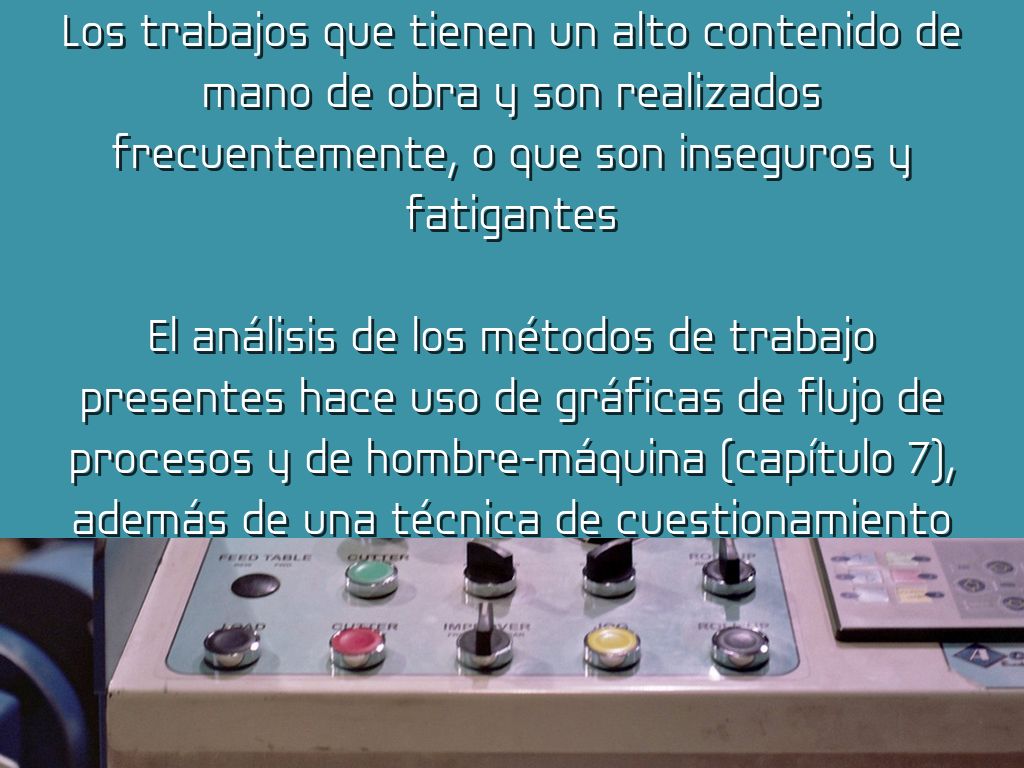 El análisis de los métodos de trabajo presentes hace uso de gráficas de flujo de procesos y de hombre-máquina (capítulo 7), además de una técnica de cuestionamiento acerca de cualquier actividad