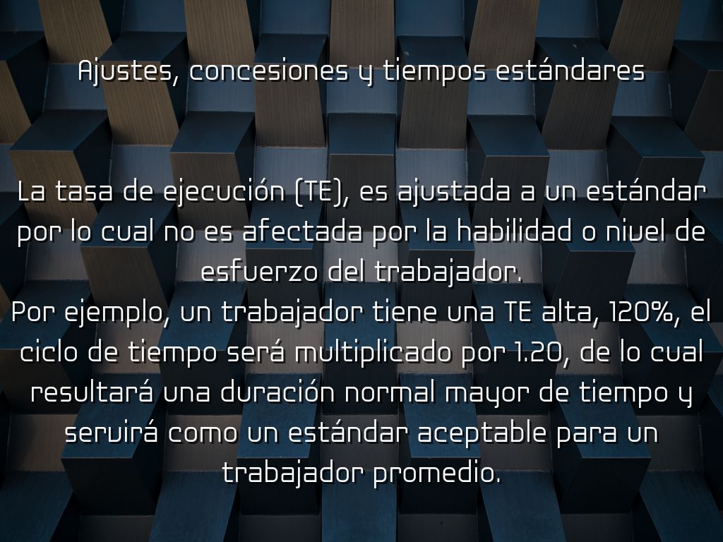 La tasa de ejecución (TE), es ajustada a un estándar por lo cual no es afectada por la habilidad o nivel de esfuerzo del trabajador.