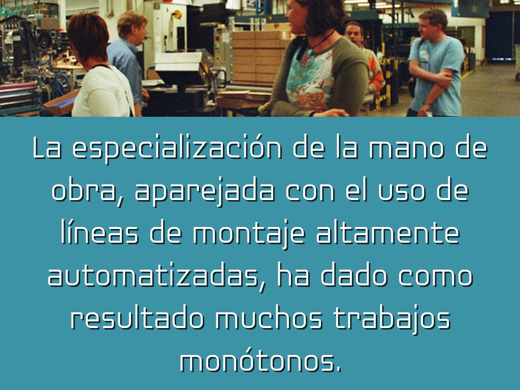La especialización de la mano de obra, aparejada con el uso de líneas de montaje altamente automatizadas, ha dado como resultado muchos trabajos monótonos.