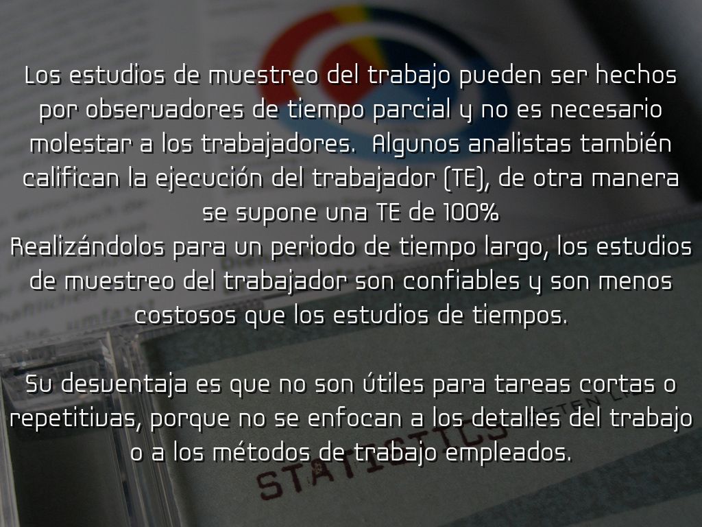 Realizándolos para un periodo de tiempo largo, los estudios de muestreo del trabajador son confiables y son menos costosos que los estudios de tiempos.