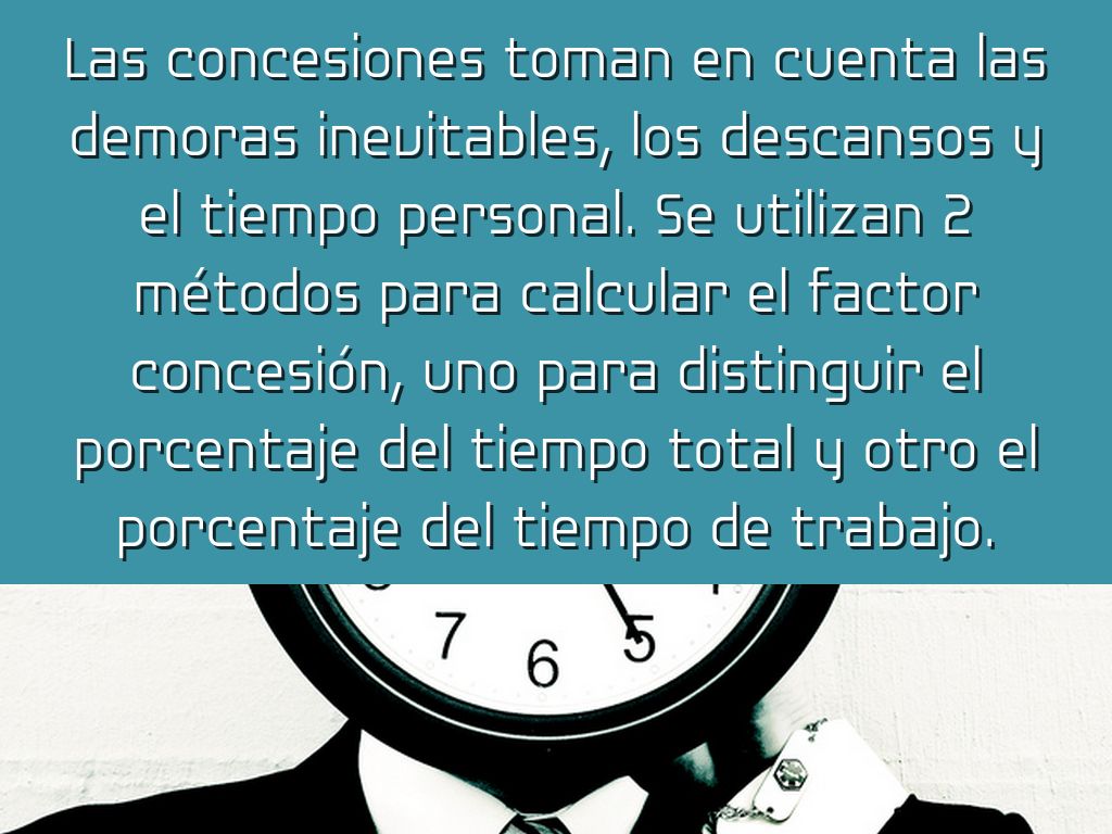 Las concesiones toman en cuenta las demoras inevitables, los descansos y el tiempo personal. Se utilizan 2 métodos para calcular el factor concesión, uno para distinguir el porcentaje del tiempo total y otro el porcentaje del tiempo de trabajo.