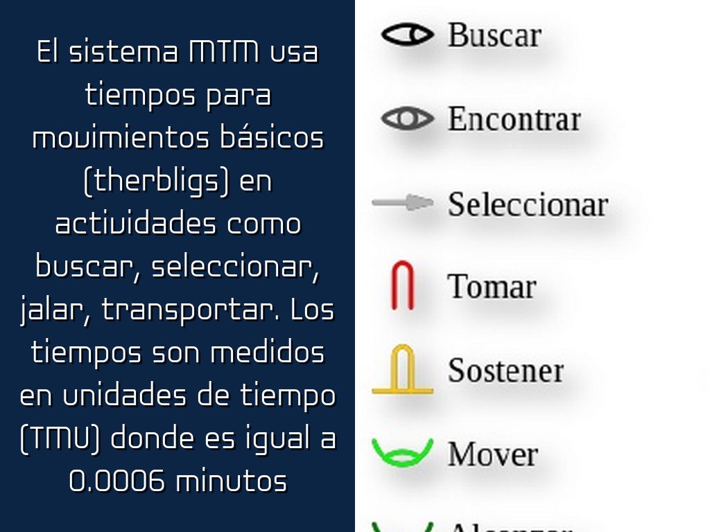 El sistema MTM usa tiempos para movimientos básicos (therbligs) en actividades como buscar, seleccionar, jalar, transportar. Los tiempos son medidos en unidades de tiempo (TMU) donde es igual a 0.0006 minutos