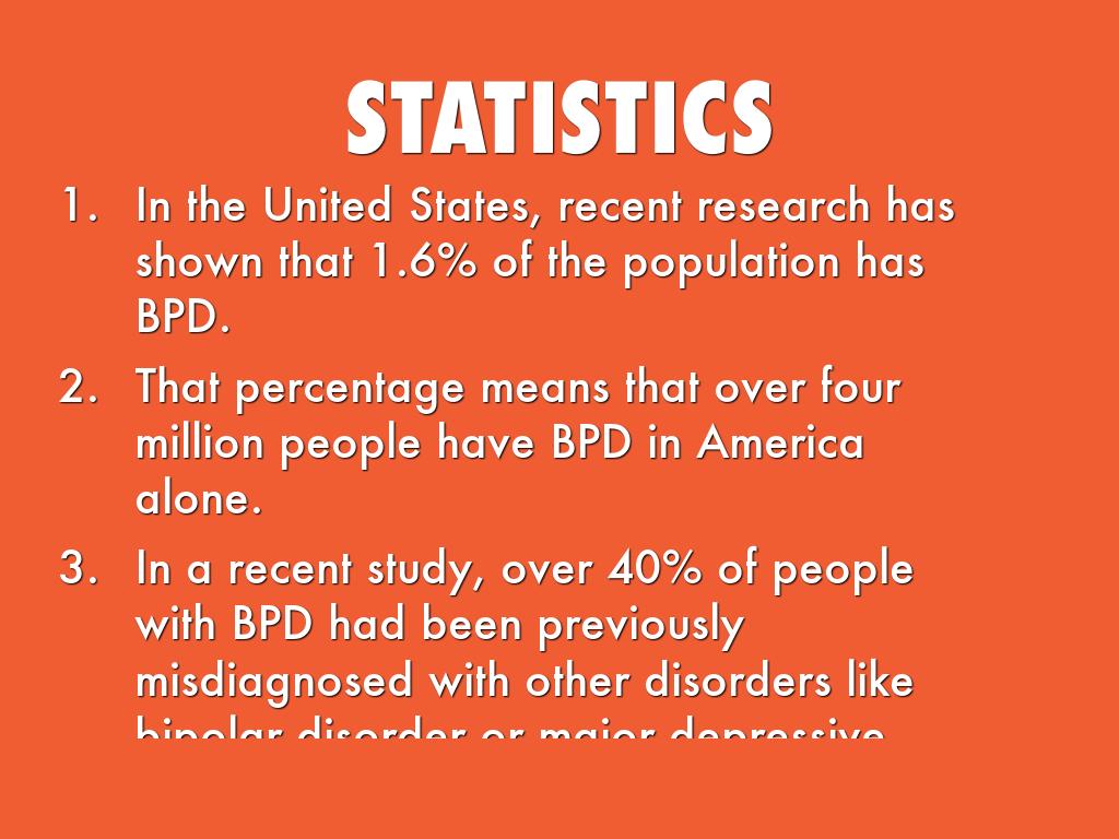 In the United States, recent research has shown that 1.6% of the population has BPD.