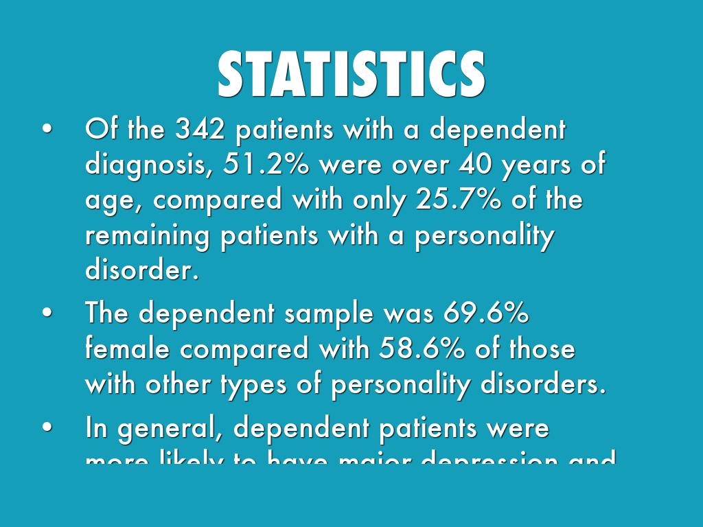 The dependent sample was 69.6% female compared with 58.6% of those with other types of personality disorders.