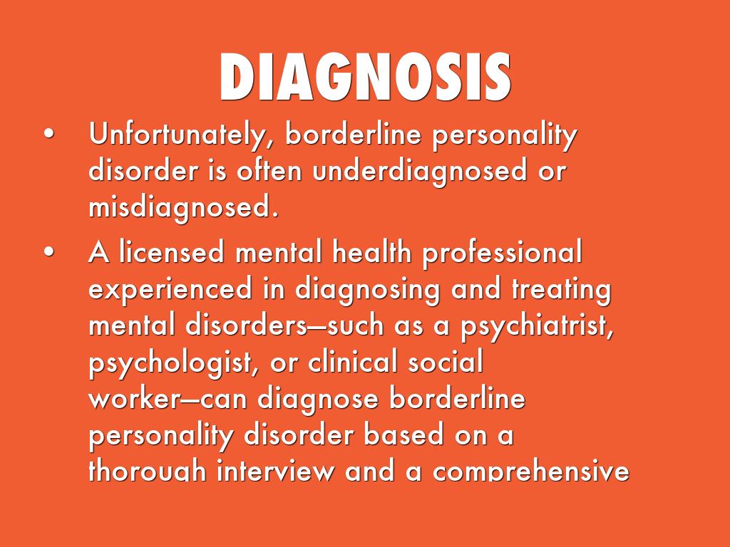 A licensed mental health professional experienced in diagnosing and treating mental disorders—such as a psychiatrist, psychologist, or clinical social worker—can diagnose borderline personality disorder based on a thorough interview and a comprehensive medical exam, which can help rule out other possible causes of symptoms.