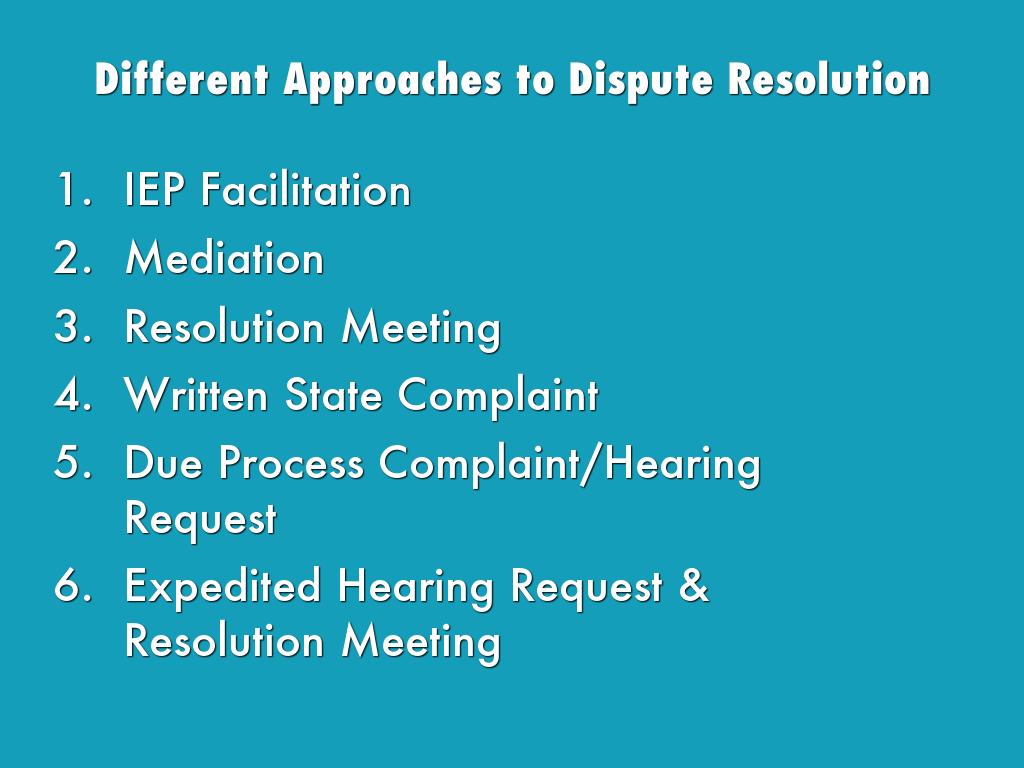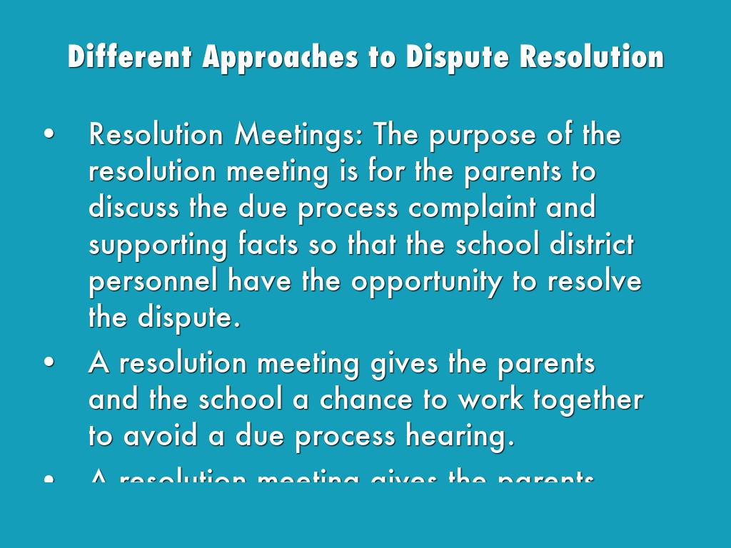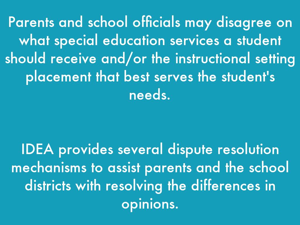 IDEA provides several dispute resolution mechanisms to assist parents and school districts with resolving the differences in opinions.