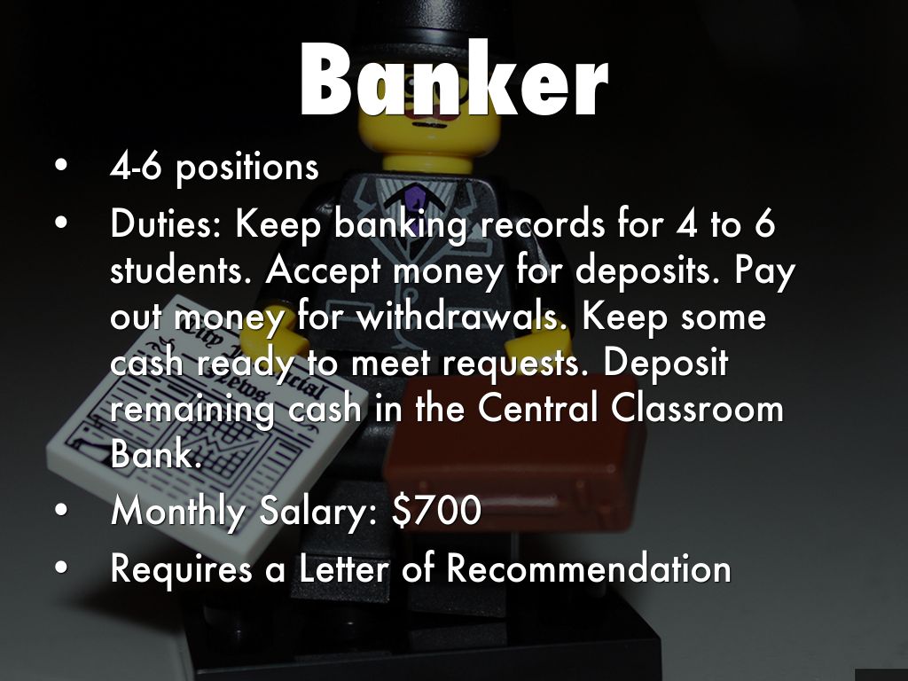 Duties: Keep banking records for 4 to 6 students. Accept money for deposits. Pay out money for withdrawals. Keep some cash ready to meet requests. Deposit remaining cash in the Central Classroom Bank.