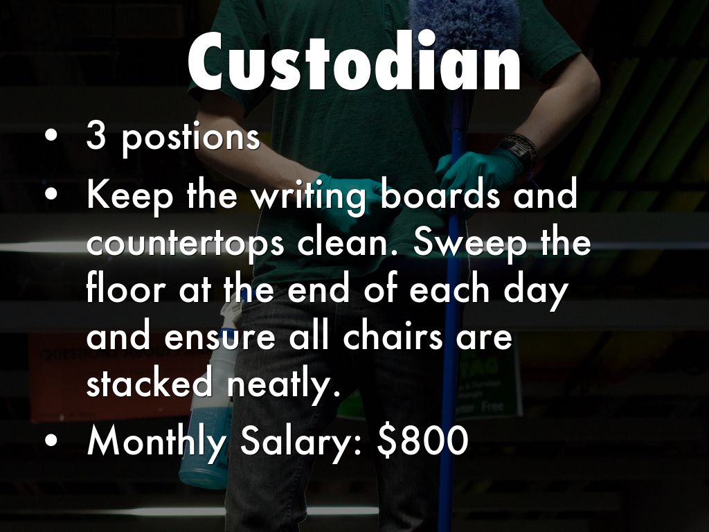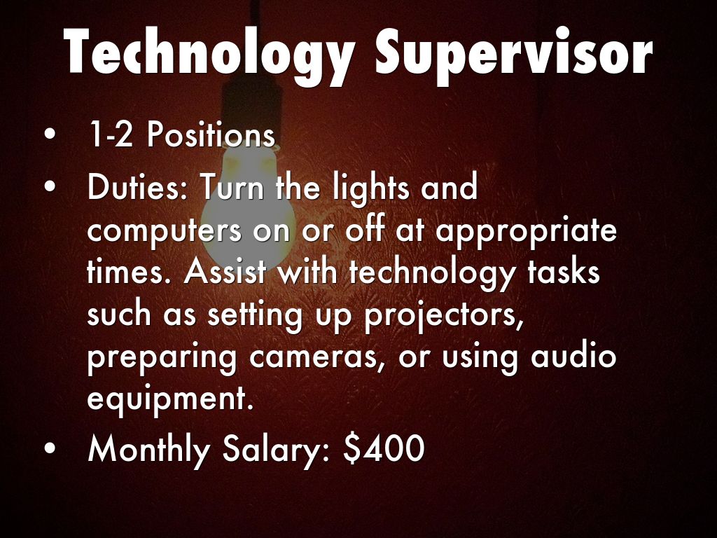Duties: Turn the lights and computers on or off at appropriate times. Assist with technology tasks such as setting up projectors, preparing cameras, or using audio equipment.