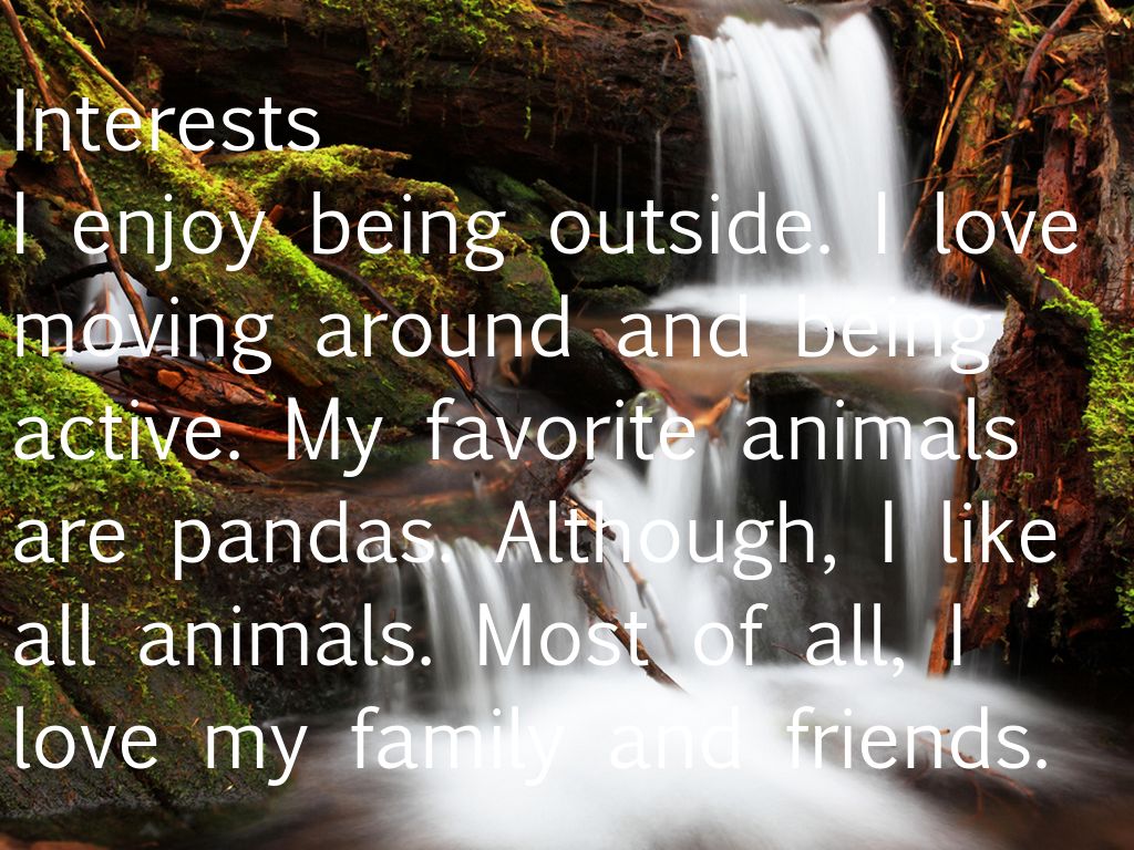I enjoy being outside. I love moving around and being active. My favorite animals are pandas. Although, I like all animals. Most of all, I love my family and friends.